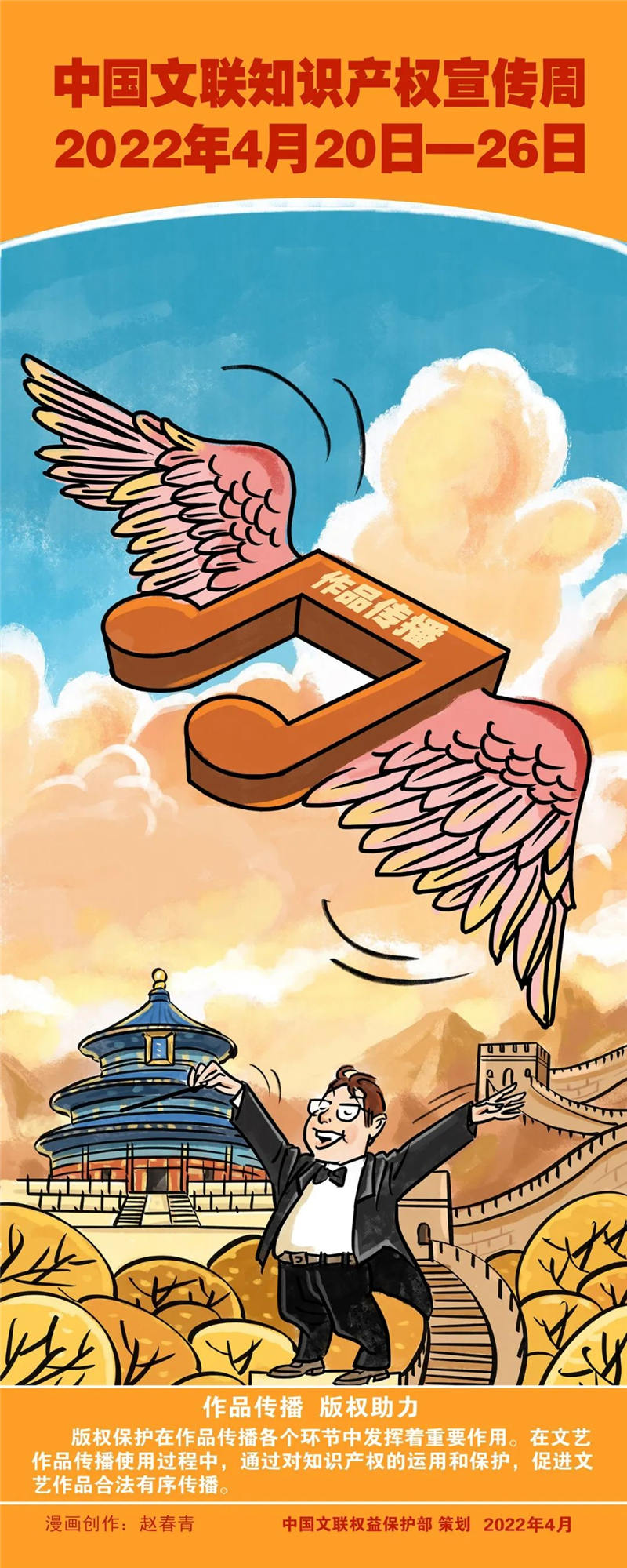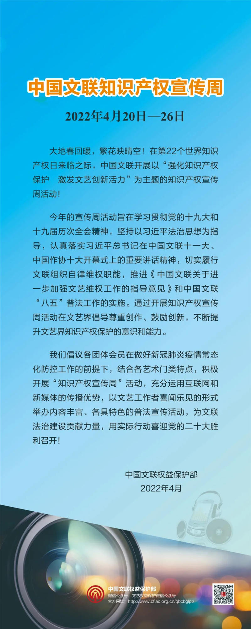 在第22个世界知识产权日来临之际,“中国文联知识产权宣传周”活动于2022年4月20日正式启动。中国文联权益保护部围绕“强化知识产权保护 激发文艺创新活力”主题策划制作了宣传海报漫画,旨在学习贯彻党的十九大和十九届历次全会精神,坚持以习近平法治思想为指导,认真落实习近平总书记在中国文联十一大、中国作协十大开幕式上的重要讲话精神,切实履行文联组织自律维权职能,推进《中国文联关于进一步加强文艺维权工作的指导意见》和中国文联“八五”普法工作的实施。通过开展知识产权宣传周活动在文艺界倡导尊重创作、鼓励创新,不断提升文艺界知识产权保护的意识和能力。