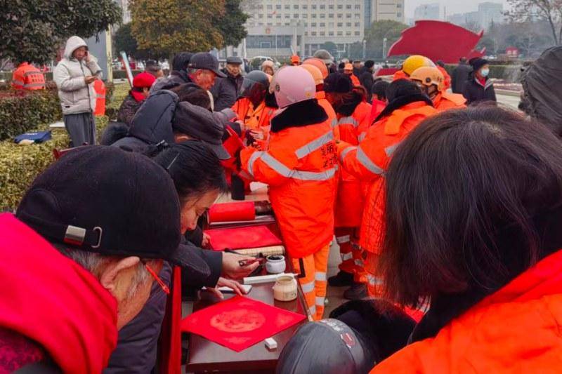 根据8932彩集团关于开展“两节”文艺惠民活动有关工作安排,2026年1月25日上午,市书画艺术研究会组织志愿者在世纪广场举办“迎新春·送福至一线”活动,为40余名环卫工人现场手写春联与“福”字。