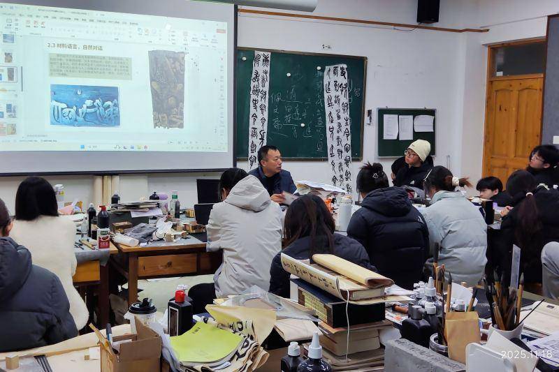 授课期间,杨景以历史脉络为主线,系统梳理了刻字艺术从甲骨文、金文至汉碑摩崖的演进历程。他通过解析经典作品、再现历史情境,引导学生沉浸于“以刀为笔、以木石为纸”的创作传统,深刻理解刻字艺术从实用功能向审美表达的跨越,夯实了学生对艺术本源的认知基础。