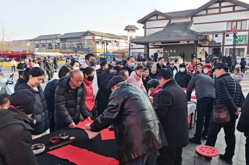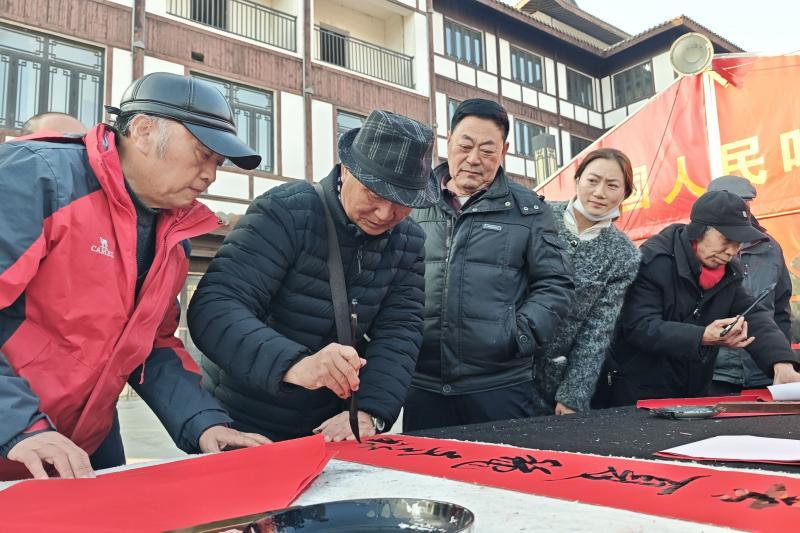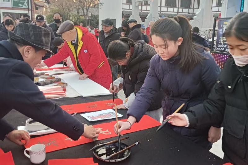 活动现场,来自该会的艺术家们组成志愿服务队,挥毫泼墨、各展所长。楷书端庄大气、行书飘逸流畅、草书灵动奔放,山水花鸟意境悠远……一幅幅饱含新春祝福的春联、“福”字,一件件彰显艺术底蕴的书画作品在笔尖应运而生。艺术家们时而凝神构思,时而落笔挥毫,墨香与烟火气交融,吸引了大批市民游客驻足观赏、拍照留念,不少游客还主动上前请教笔法技巧,艺术家们耐心指导,现场互动频频、暖意融融。“这次活动把书画艺术搬到古镇景区,既接地气又有格调,不仅能近距离欣赏艺术家现场创作,还能免费领取春联,让我提前感受到了过年的氛围。”带着孩子前来游玩的市民王女士笑着说。